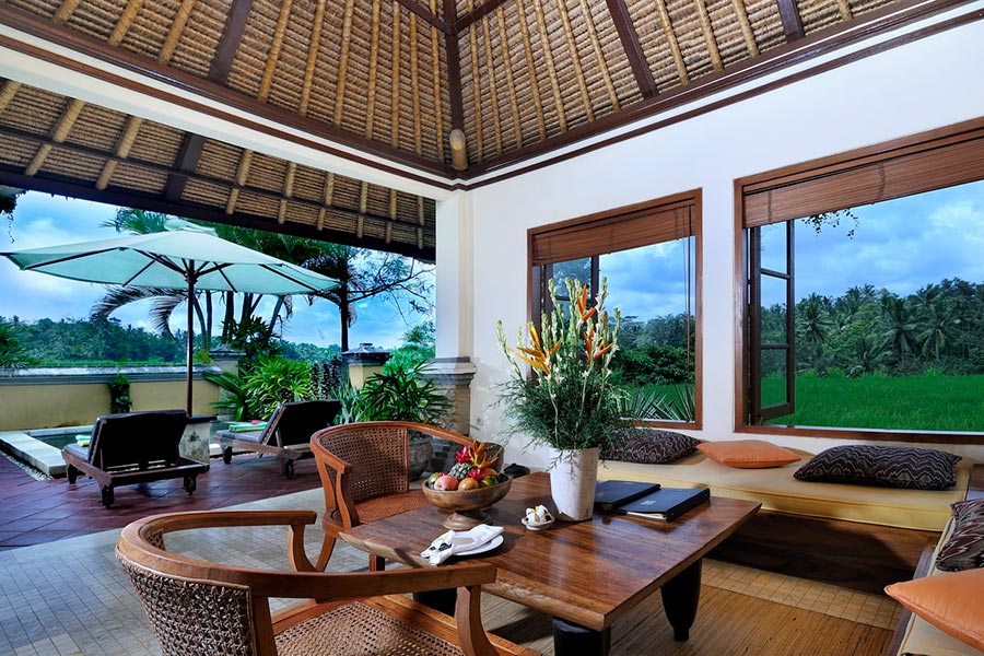 Each villa features a generously proportioned living area and a beautifully appointed bedroom, thoughtfully designed with traditional Balinese elements complemented by modern comforts. The indoor living space opens seamlessly onto a private outdoor area, allowing uninterrupted views of the surrounding emerald rice fields to become a constant and calming presence throughout your stay.
